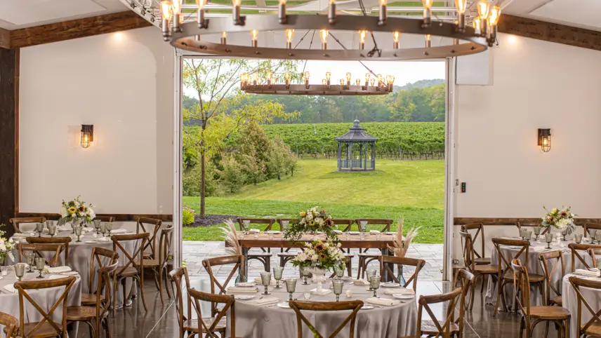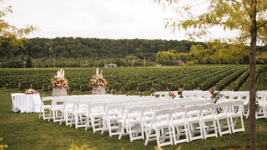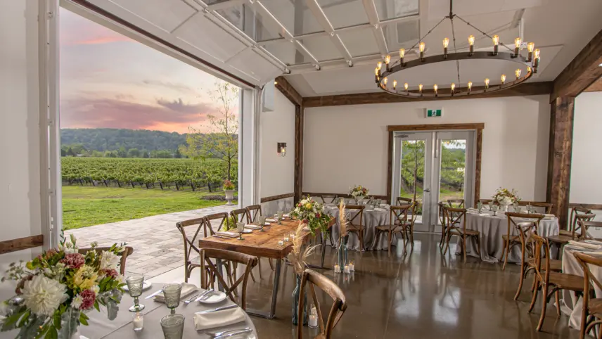 Overlooking sprawling vineyards, this idyllic wedding ceremony venue invites you to say “I do” in the open air, surrounded by breathtaking vistas of the lush, tree-lined Niagara Escarpment.